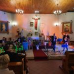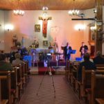 Potrzeba zatrzymania się sprawiła, że nasi parafianie zaproponowali zorganizowanie koncertu upamiętniającego św. Jana Pawła II. Niestety czas zakazów zgromadzeń uniemożliwił zorganizowania koncertu (bo to spotkanie publiczne zakazane na dzisiaj) na szeroką skalę. Trzeba było znaleźć inną formułę ( bo przecież donoszący nie śpią) – stąd pomysł nabożeństwa ograniczonego do 37 osób – tyle mogło być w świątyni. Na szczęście nasi youtuberzy – operatorzy (tym razem p. Krzysztof) rozszerzyli granicę świątyni przesyłając wizję z fonią do tych, którzy chcieli uczestniczyć w nowej chrześcijańskiej formule „duchowo”. Tym sposobem uporaliśmy się z ograniczeniami (szkoda, że nie ma wystarczającego parkingu dla samochodów przy kościele, bo na zamówienie przyjechał patrol chcąc ukarać parkujących po drugiej stronie drogi (uwaga duszpasterska – każdemu może się to zdarzyć, stąd lepiej tam nie parkować) i mogliśmy uczestniczyć w wydarzeniu ku czci św. Jana Pawła II. Świątynia wypełniła się dźwiękami – tym razem nie religijnymi, ale metafizycznymi, z repertuaru Starego Dobrego Małżeństwa. Wielu obecnym wzruszenie wymalowało się wypiekami na twarzach i szklistymi oczami. Śpiew p. Jarosława Pikuły, dźwięki saksofonu wydobywane dla nas przez p. Andrzeja Jóźwiaka oraz akompaniament gitarowy spod palców p. Tomasza i Olafa Makuchowskich – to wszystko prowadziło nas przez mgły i manowce do oczywistych rzeczy w życiu czcigodnego Jubilata.