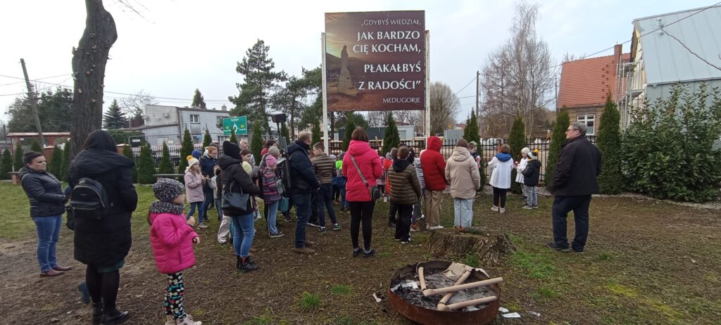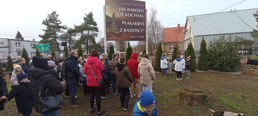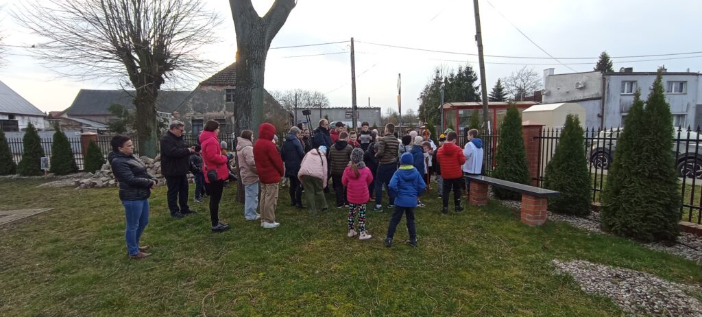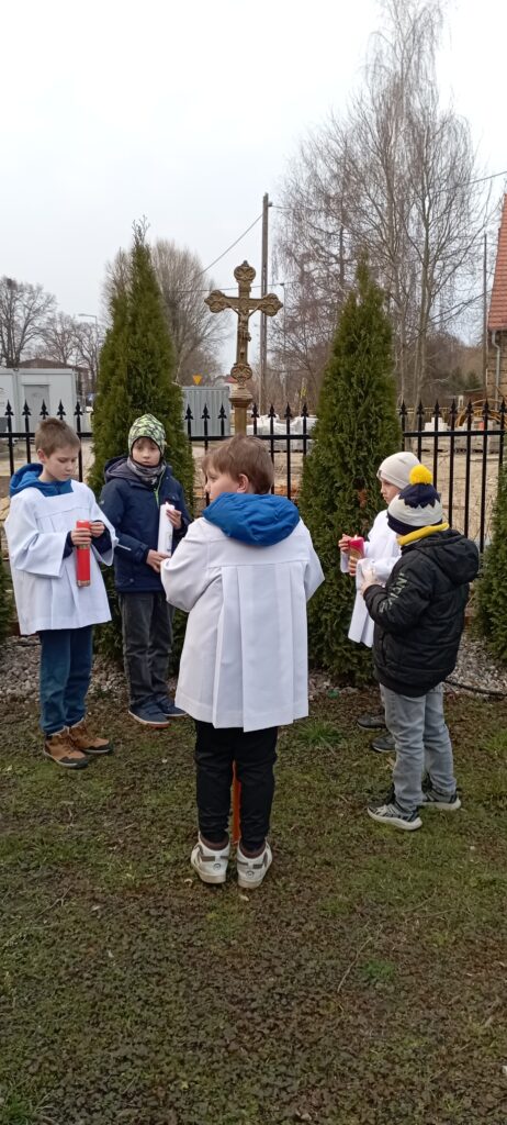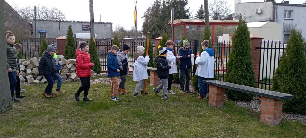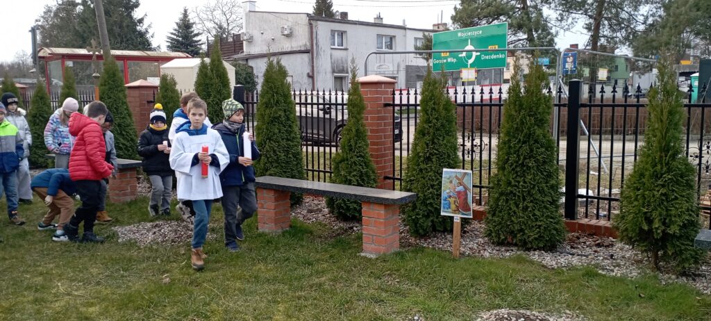 Z powodu remontu świątyni, Drogę Krzyżową odprawiamy przy kościele. W zasadzie obecne są dzieci przygotowujące się do życia dwoma kolejnymi sakramentami – łaską pojednania w spowiedzi oraz pełnego uczestnictwa w Eucharystii. Towarzyszą im niektórzy rodzice, im gratuluję towarzyszenia dzieciom w ważnych dla nich wydarzeniach. Na następną Drogę Krzyżową w piątek o godz. 16.30 zapraszamy wszystkie dzieci z Wawrowa.