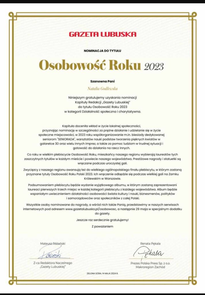 Z ogromnym wzruszeniem i radością przyjęłam wiadomość o nominacji do tytułu Osobowość Roku 2023 w kategorii działalność społeczna i charytatywna. Jest to dla mnie wielki zaszczyt i wyróżnienie, które motywuje mnie do dalszego działania na rzecz naszej społeczności. Dziękuję osobie, która mnie nominowała