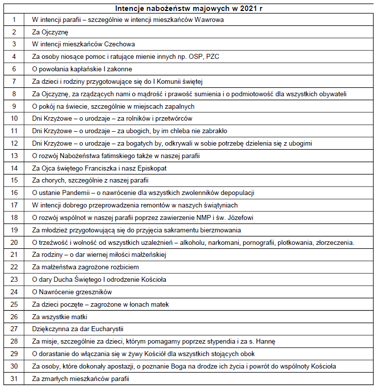 Intencje Nabożeństw Majowych przez parafia · Opublikowano 29 kwietnia 2021 · Zaktualizowano 29 kwietnia 2021 Nabożeństwa Majowe w Wawrowie o godz. 8.30 i 17.30, w niedzielę Nabożeństwo przede mszą św. o godz. 9.00 w Czechowie o 18.00 w środy, piątki, a w niedziele – pół godziny przede mszą św. Tweet