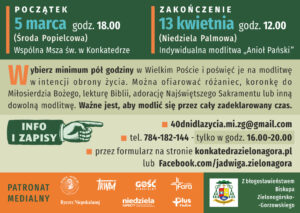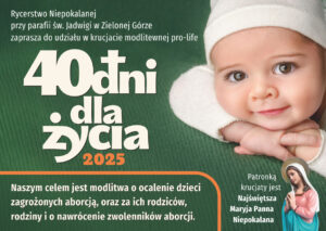 Rycerstwo Niepokalanej przy parafii konkatedralnej w Zielonej Górze zaprasza do udziału w krucjacie modlitewnej pro-life 40 Dni dla Życia 2025 – w intencji dzieci nienarodzonych, ich rodziców, rodzin oraz o nawrócenie zwolenników aborcji. Wystarczy wybrać minimum pół godziny w Wielkim Poście i poświęcić na modlitwę w intencjach krucjaty. Można ofiarować różaniec, koronkę do Miłosierdzia Bożego, lekturę Biblii, adorację Najświętszego Sakramentu lub inną dowolną modlitwę. Ważne jest, aby modlić się przez cały zadeklarowany czas.