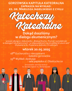 - We wtorek 20 maja o godz. 19 zapraszamy do sali papieskiej na plebanii katedralnej na ostatnią w tym semestrze katechezę katedralną. Tematem wykładu ks. Mariusza Jagielskiego będzie omówienie dokumentu o posłudze papieża w kontekście ekumenicznym.
