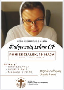 - W poniedziałek19.05 Parafia Męczenników zaprasza na wieczór uwielbienia z dominikanką s. Małgorzata Lekan. Modlitwa rozpocznie się Mszą święta o godz. 18:00 a zakończy nabożeństwem majowym o 21.