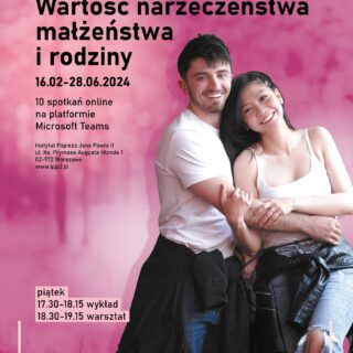 Instytut Papieża Jana Pawła II, wychodząc naprzeciw potrzebom współczesnych narzeczonych, małżeństw i rodzin, od 16 lutego 2024 roku rozpoczyna kurs online Wartość narzeczeństwa, małżeństwa i rodziny. Zajęcia...