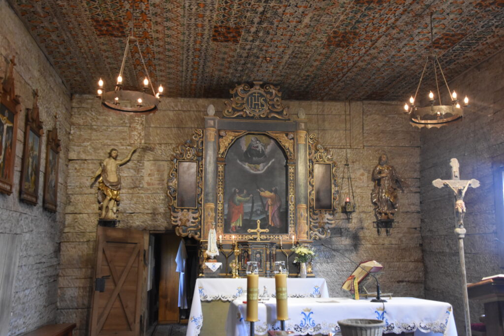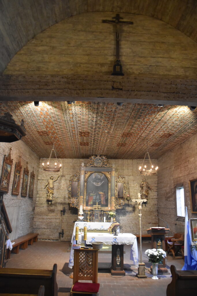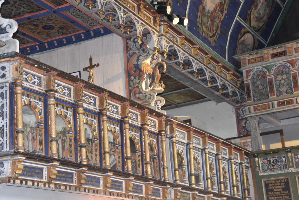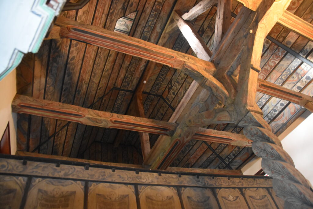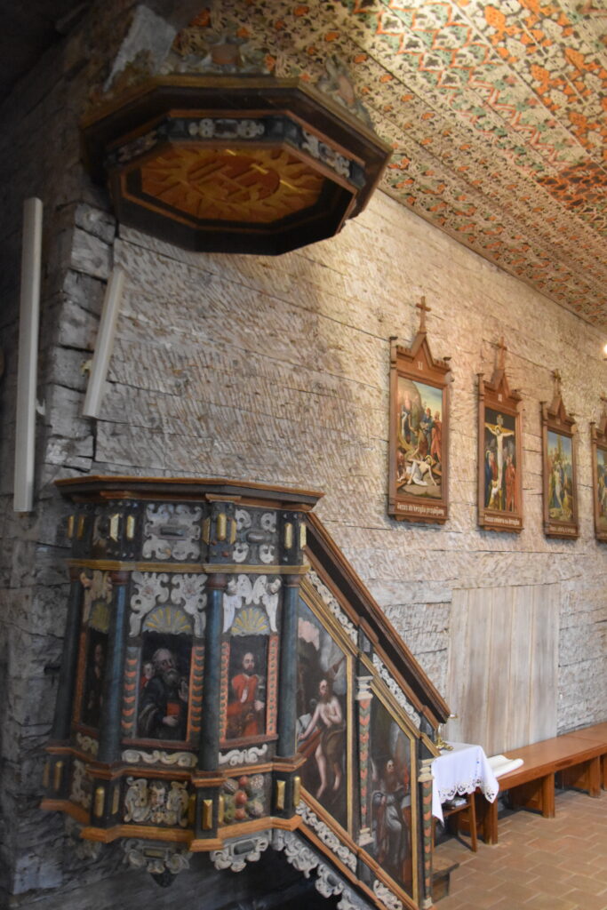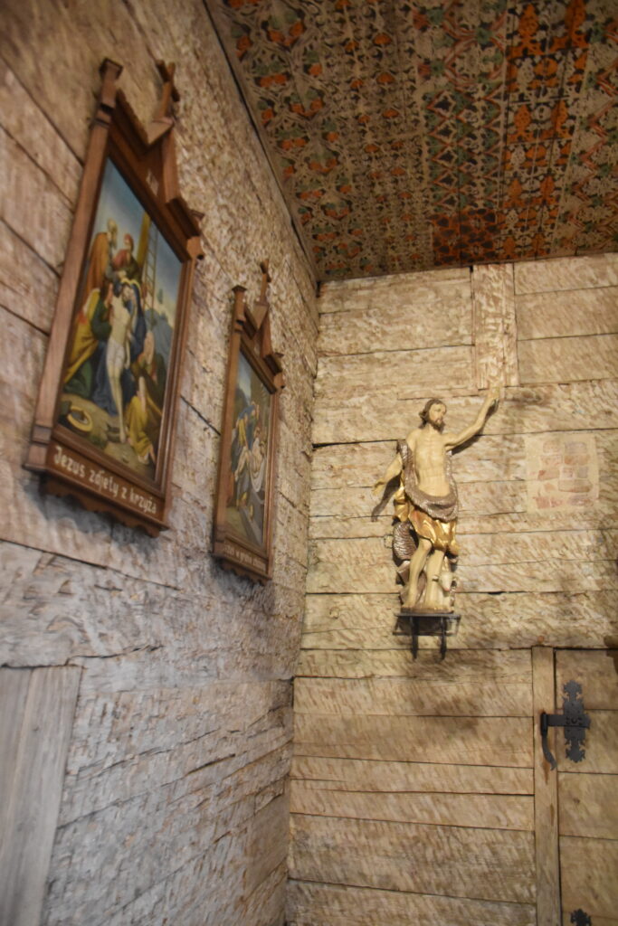 Wewnątrz dach jest oparty przez jeden ozdobnie rzeźbiony słup. Wewnątrz świątyni umieszczone są dwie empory wzdłuż nawy i jedna wokół ołtarza. Polichromia ludowa przedstawiająca motywy roślinne, wykonana w 1651 roku przez Krzysztofa Penzeliusza. Przedstawienie Sądu Ostatecznego umieszczone jest na suficie prezbiterium i balustradach empor. Uzupełnione w 1 połowie XX wieku. przez Kutschmanna.