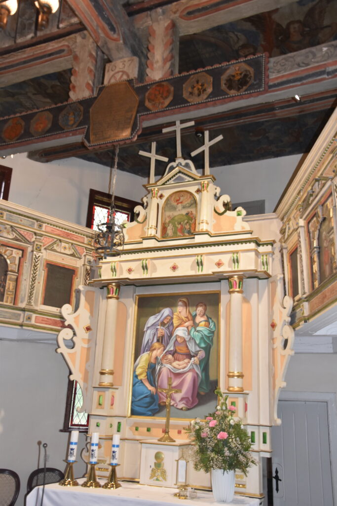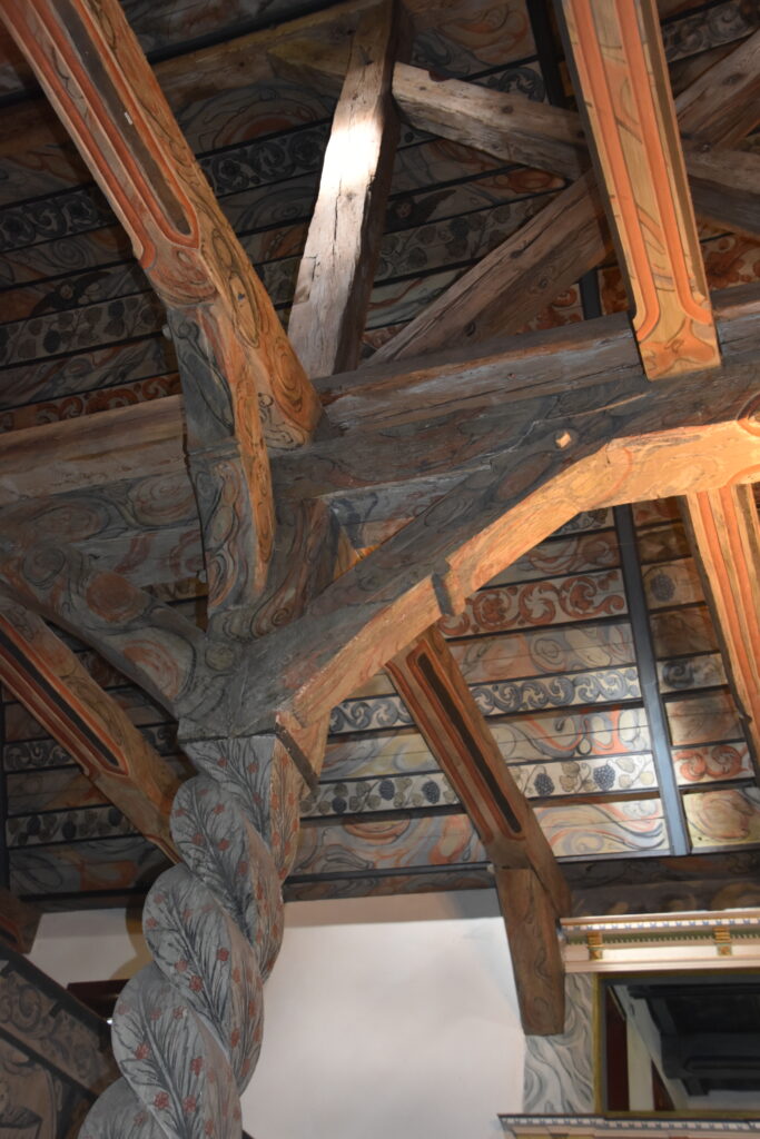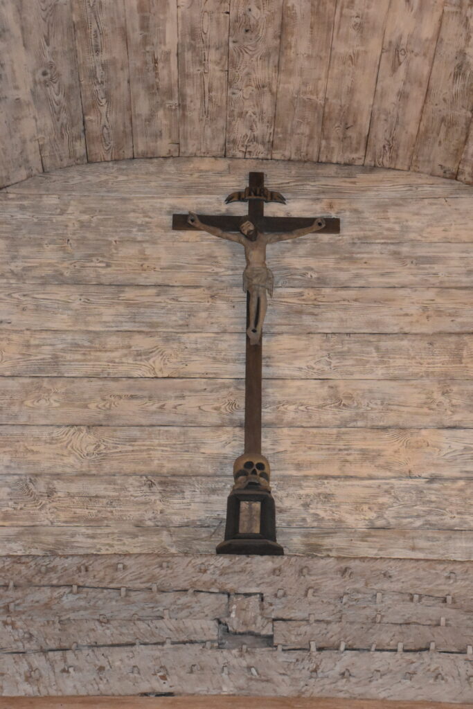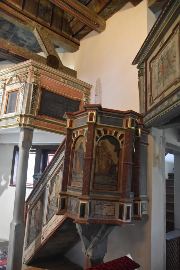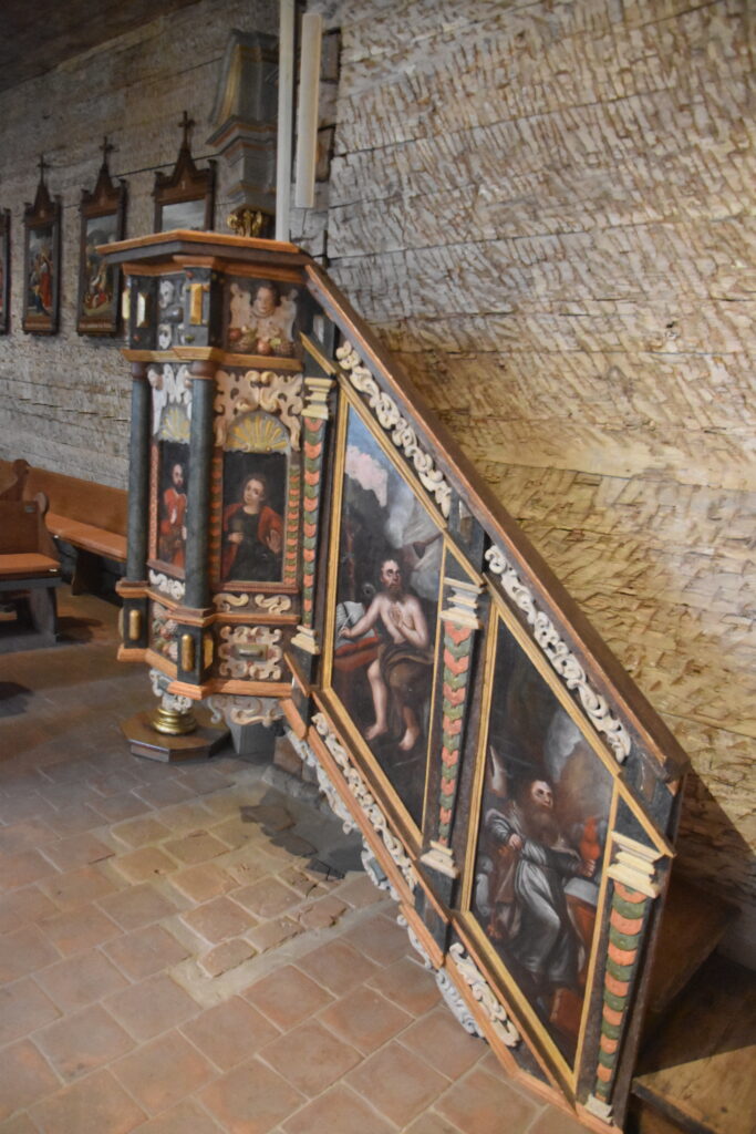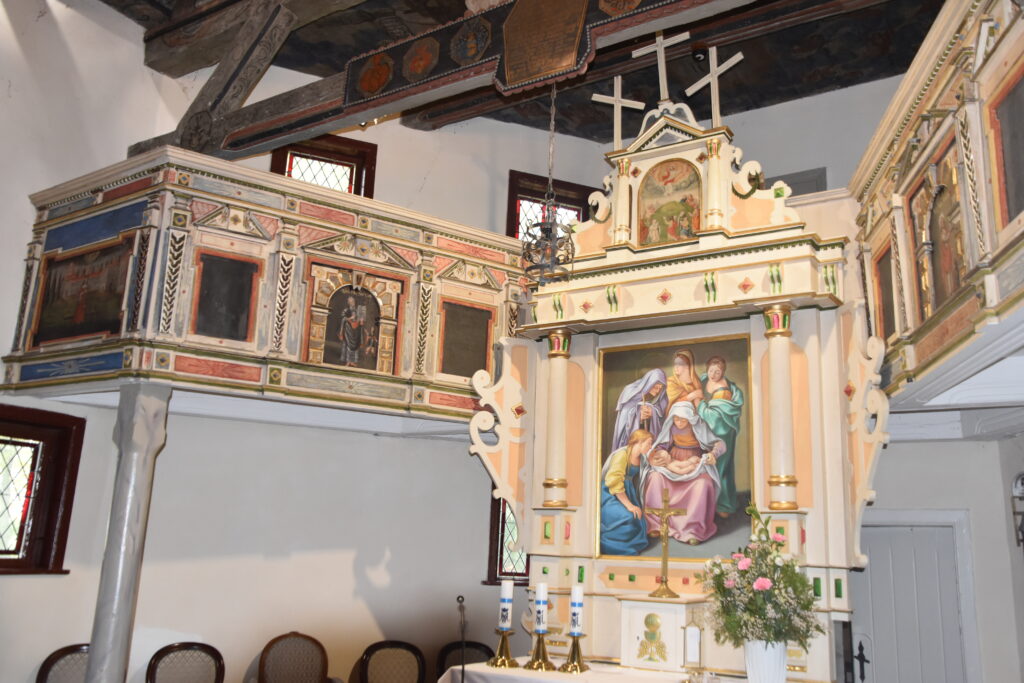 Wewnątrz dach jest oparty przez jeden ozdobnie rzeźbiony słup. Wewnątrz świątyni umieszczone są dwie empory wzdłuż nawy i jedna wokół ołtarza. Polichromia ludowa przedstawiająca motywy roślinne, wykonana w 1651 roku przez Krzysztofa Penzeliusza. Przedstawienie Sądu Ostatecznego umieszczone jest na suficie prezbiterium i balustradach empor. Uzupełnione w 1 połowie XX wieku. przez Kutschmanna.