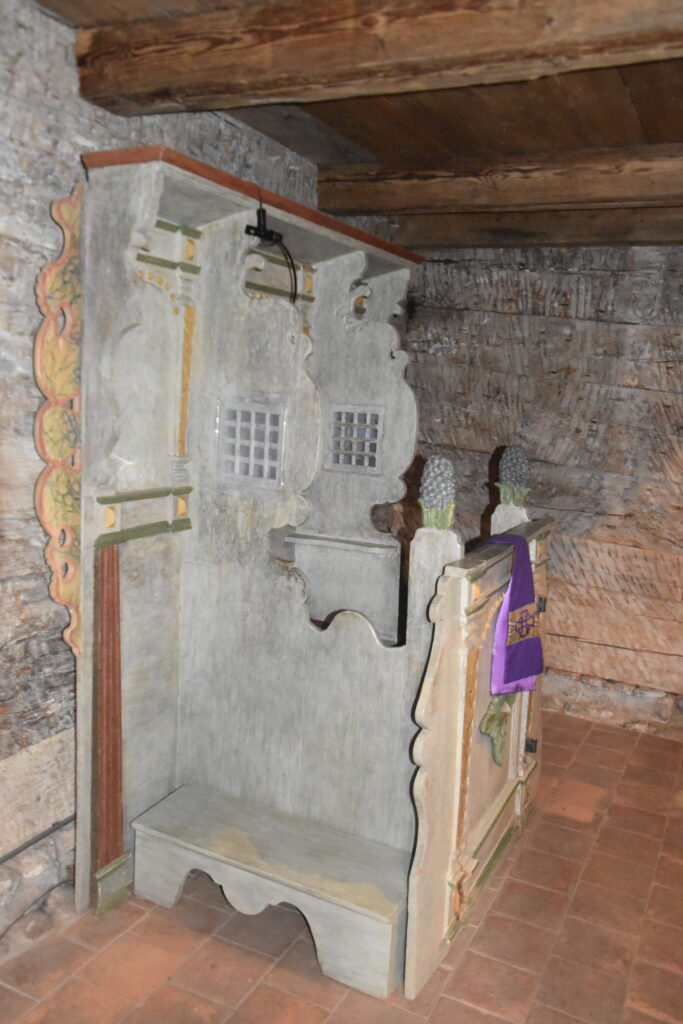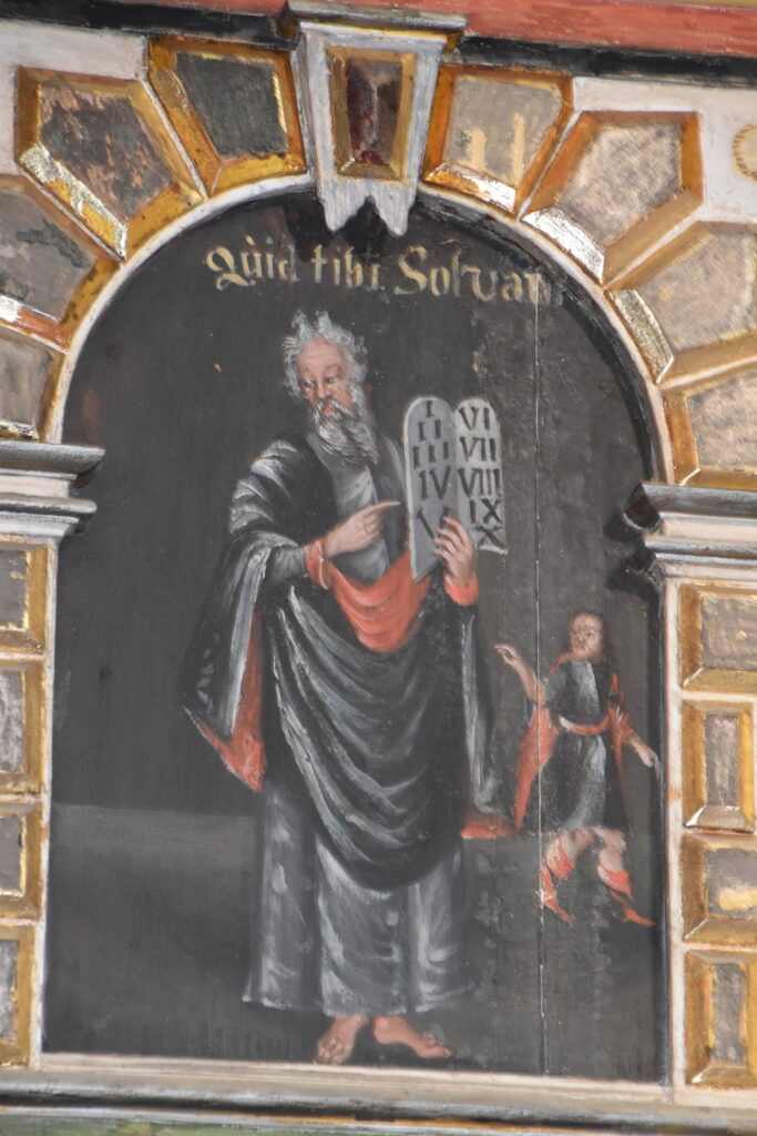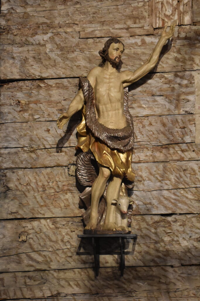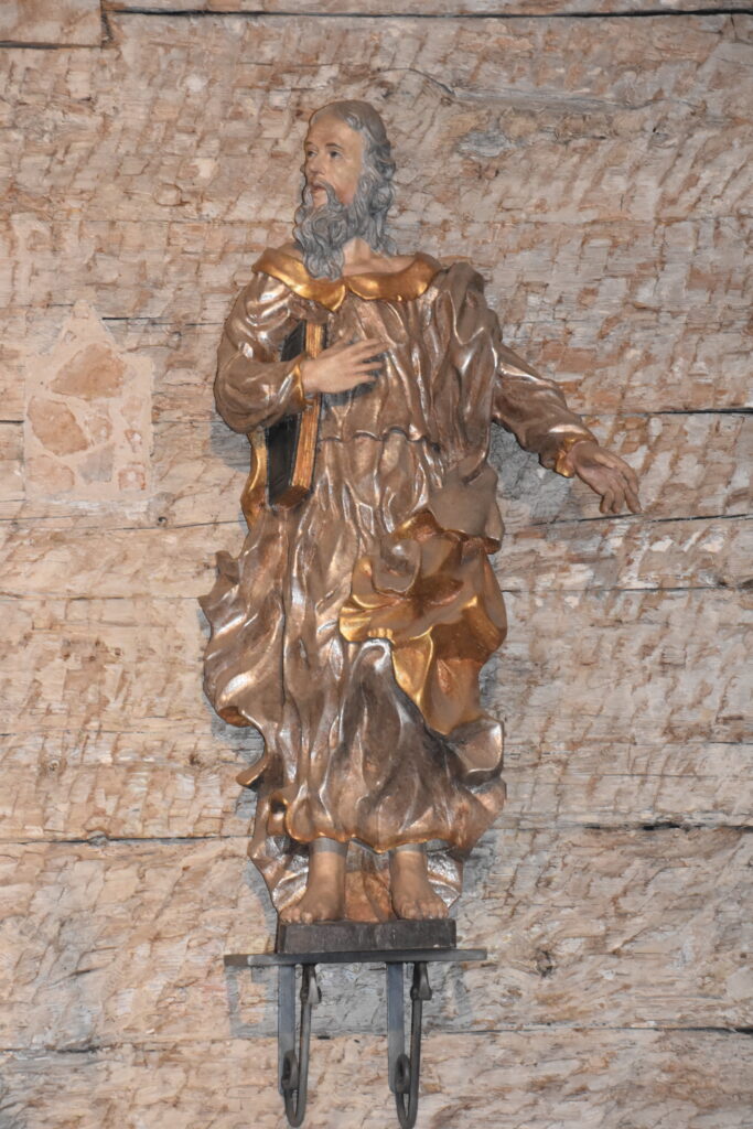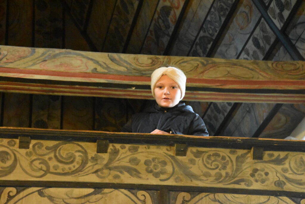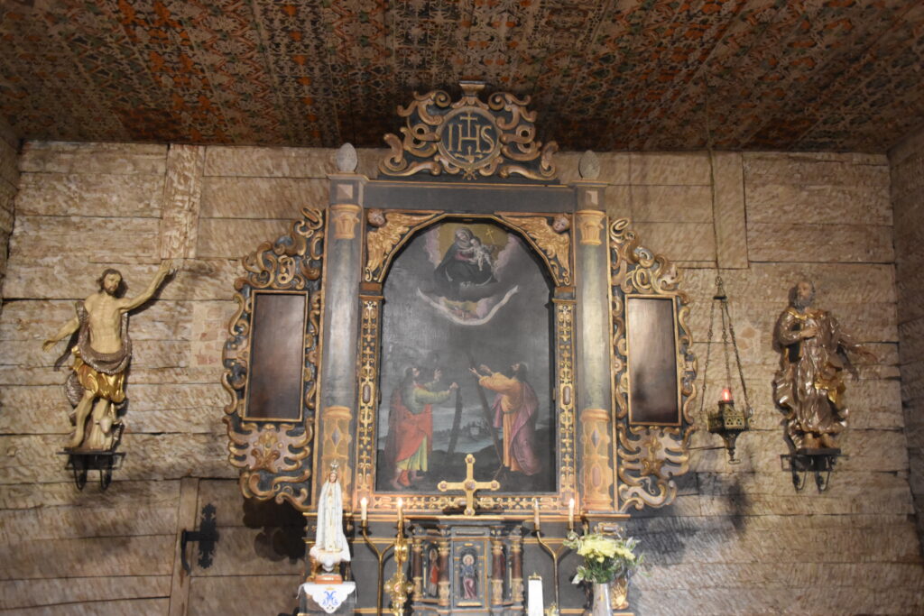 Wewnątrz dach jest oparty przez jeden ozdobnie rzeźbiony słup. Wewnątrz świątyni umieszczone są dwie empory wzdłuż nawy i jedna wokół ołtarza. Polichromia ludowa przedstawiająca motywy roślinne, wykonana w 1651 roku przez Krzysztofa Penzeliusza. Przedstawienie Sądu Ostatecznego umieszczone jest na suficie prezbiterium i balustradach empor. Uzupełnione w 1 połowie XX wieku. przez Kutschmanna.
