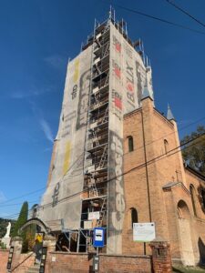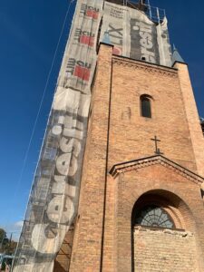 Z funduszy Polskiego Ładu prowadzona jest modernizacja wieży kościelnej.