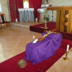 W Wielką Sobotę przez cały dzień mogliśmy adorować Jezusa w Grobie i ucałować Krzyż. Szczególną okazję ku temu stanowił obrzęd święcenia pokarmów. Kilka zdjęć poniżej. Parafianie przynieśli dary dla mężczyzn osadzonych w pobliskim Zakładzie Karnym , które po poświęceniu ksiądz proboszcz przekazał więźniom.