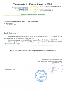 W czasie naszej pielgrzymki odwiedziliśmy Hospicjum w Wilnie założone i prowadzone przez siostrę Michaelę Rak, która tworzyła również hospicjum w Gorzowie. Wizyta w hospicjum zrobiła na wszystkich uczestnikach ogromne wrażenie. Pani Wilhelmina Rother w imieniu Towarzystwa Miłośników Wilna i Ziemi Wileńskiej przekazała obrusy, a wszyscy pielgrzymi złożyli ofiarę na budowę nowego hospicjum dla dzieci.